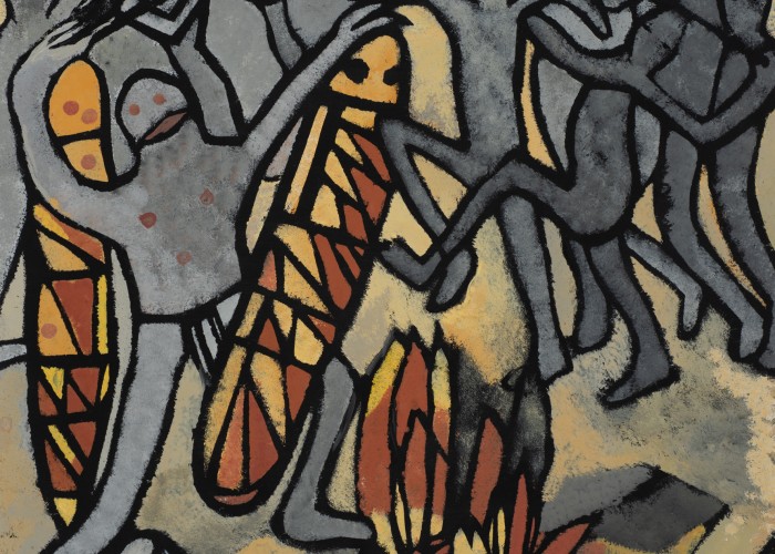 Image: Margaret Preston. Aborigines Preparing for a fight. Gouache stencil on black paper. 35.2 x 32.0 cm (sight)